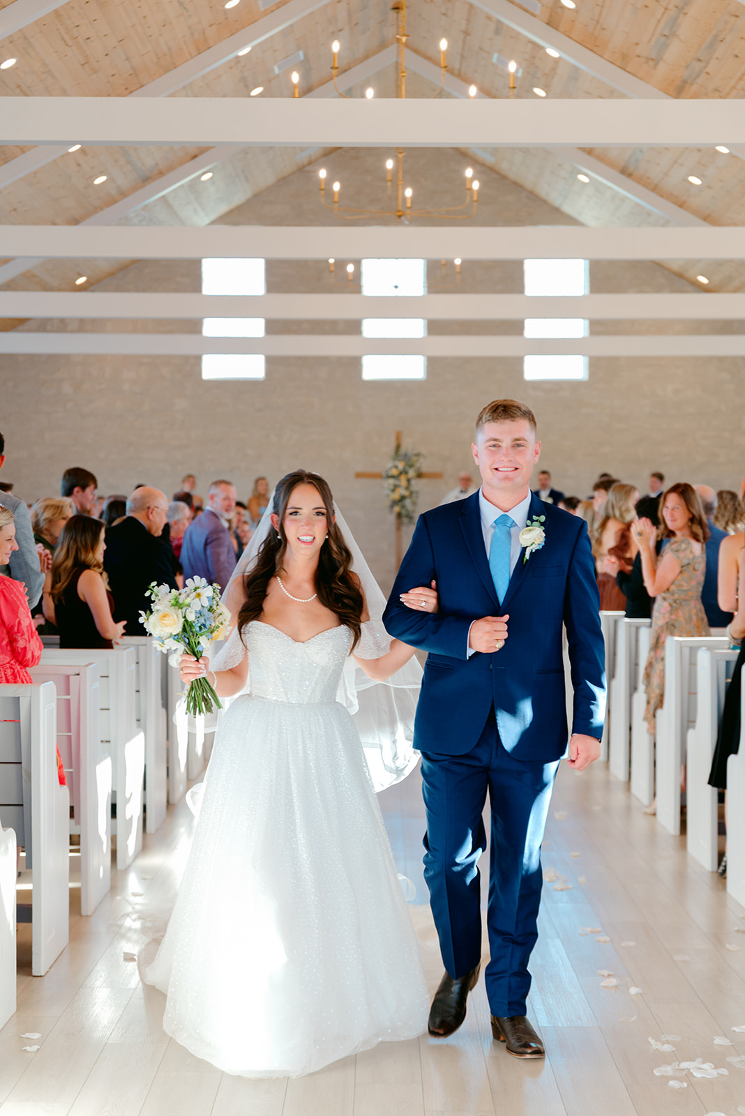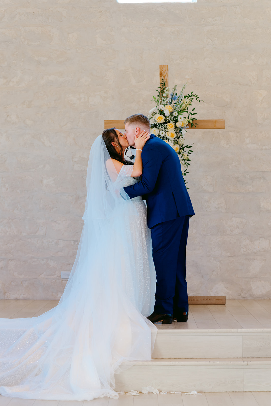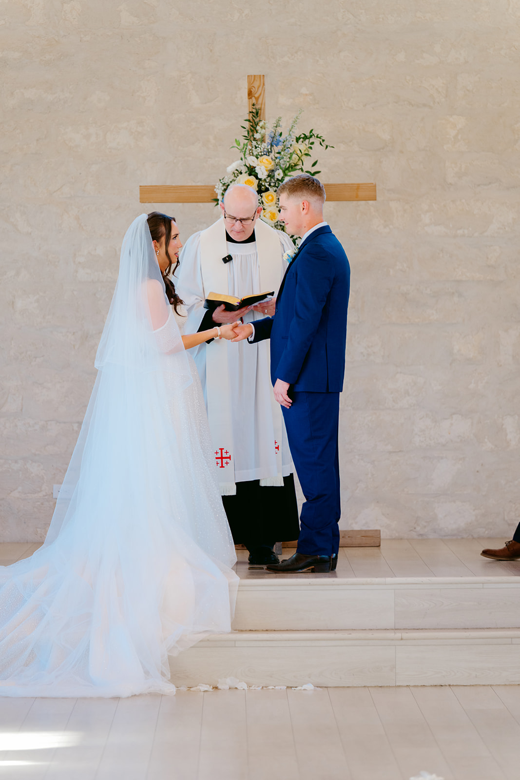 At the front of the chapel, a cross adorned with blue and yellow florals served as a beautiful focal point. Three flower girls in white dresses with blue bows added an extra touch of sweetness as they walked down the aisle.