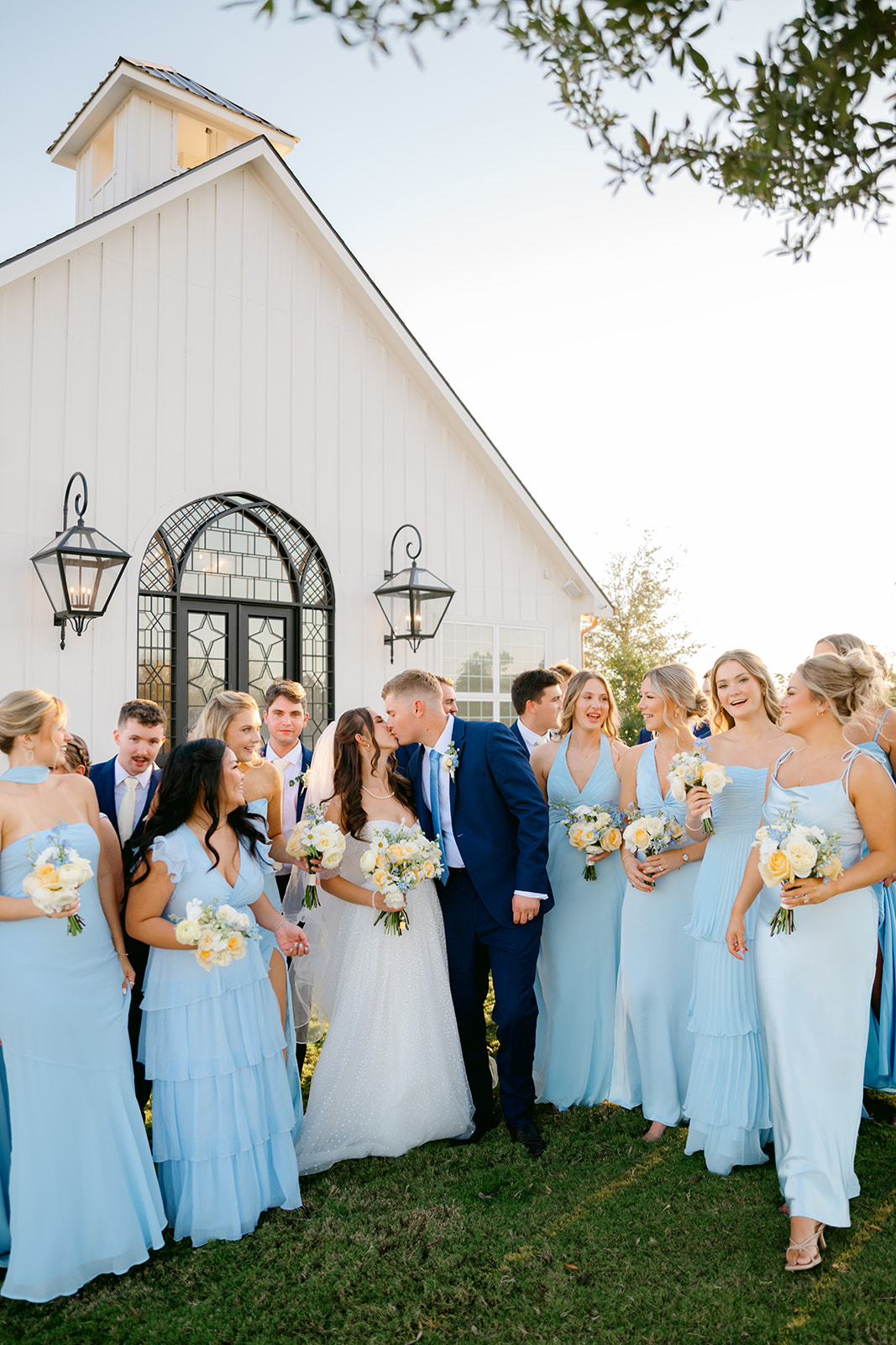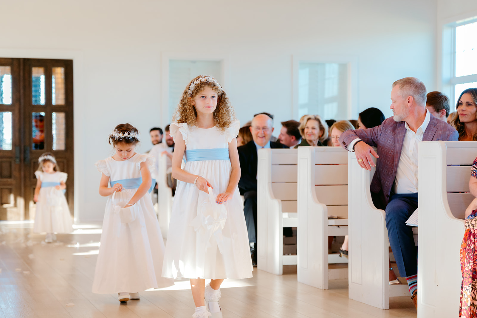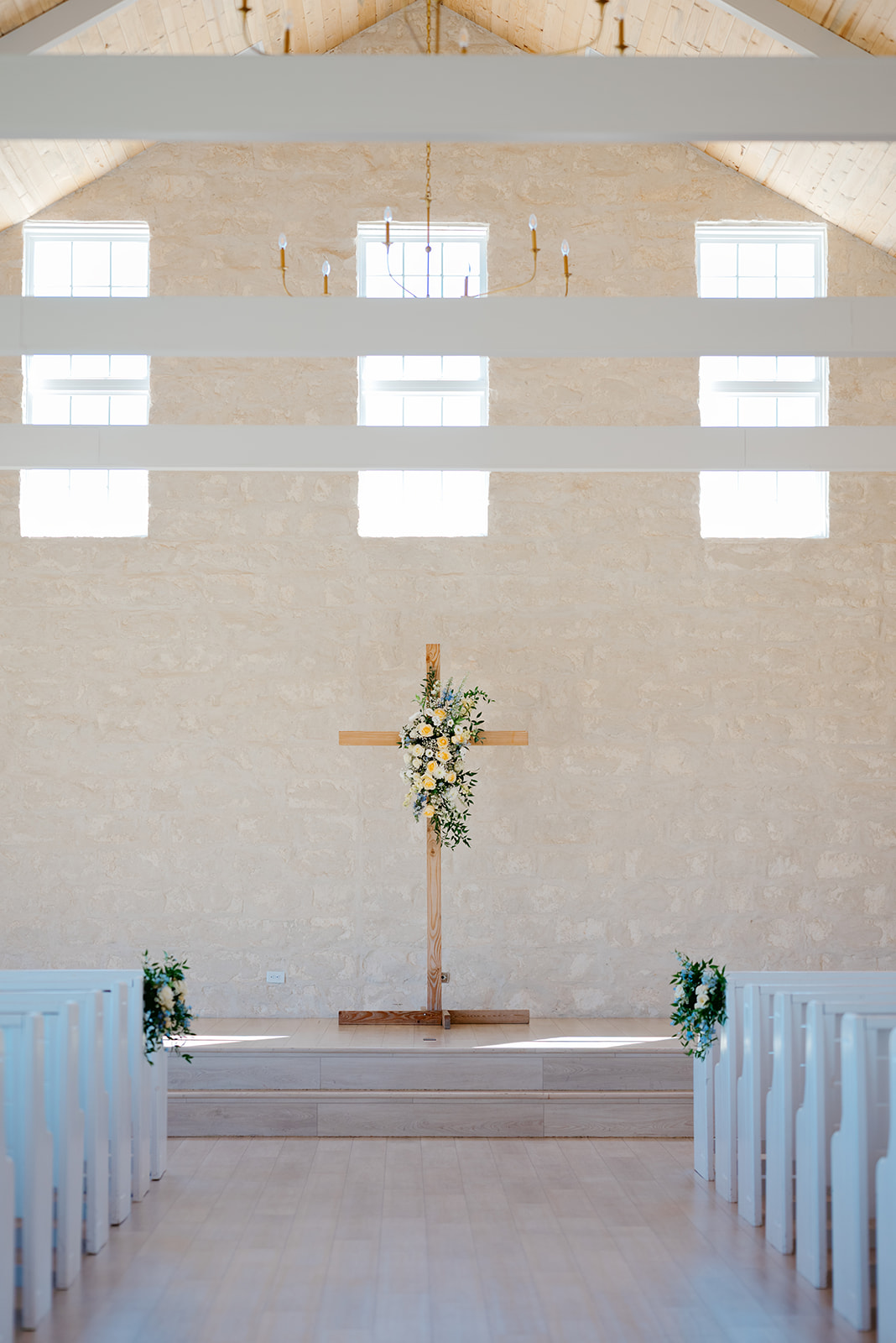 At the front of the chapel, a cross adorned with blue and yellow florals served as a beautiful focal point. Three flower girls in white dresses with blue bows added an extra touch of sweetness as they walked down the aisle.