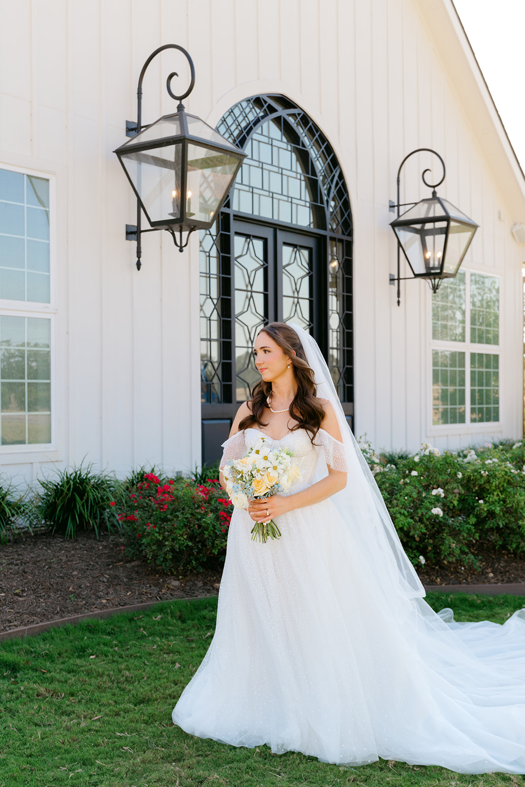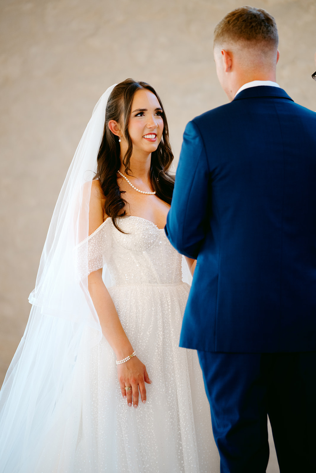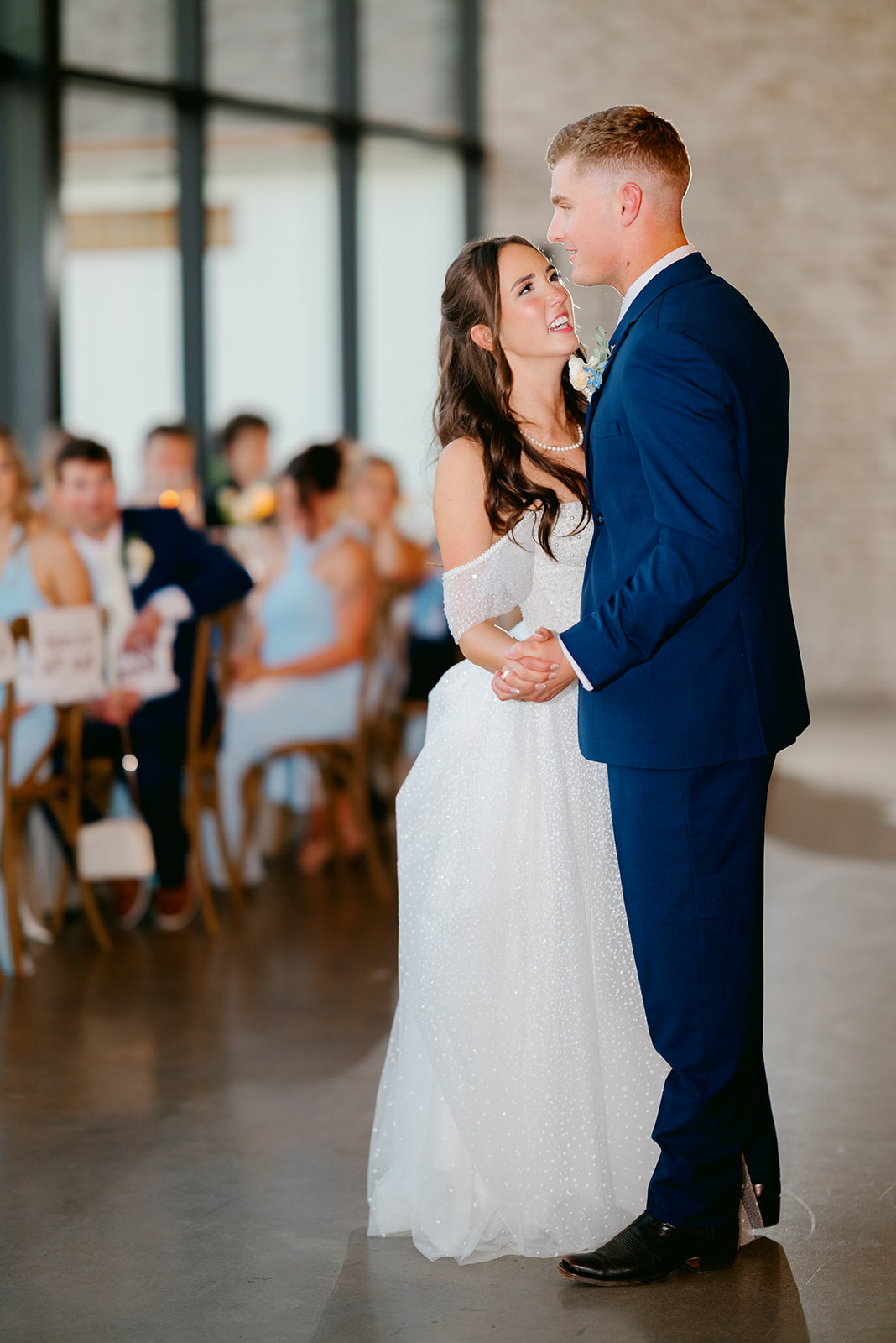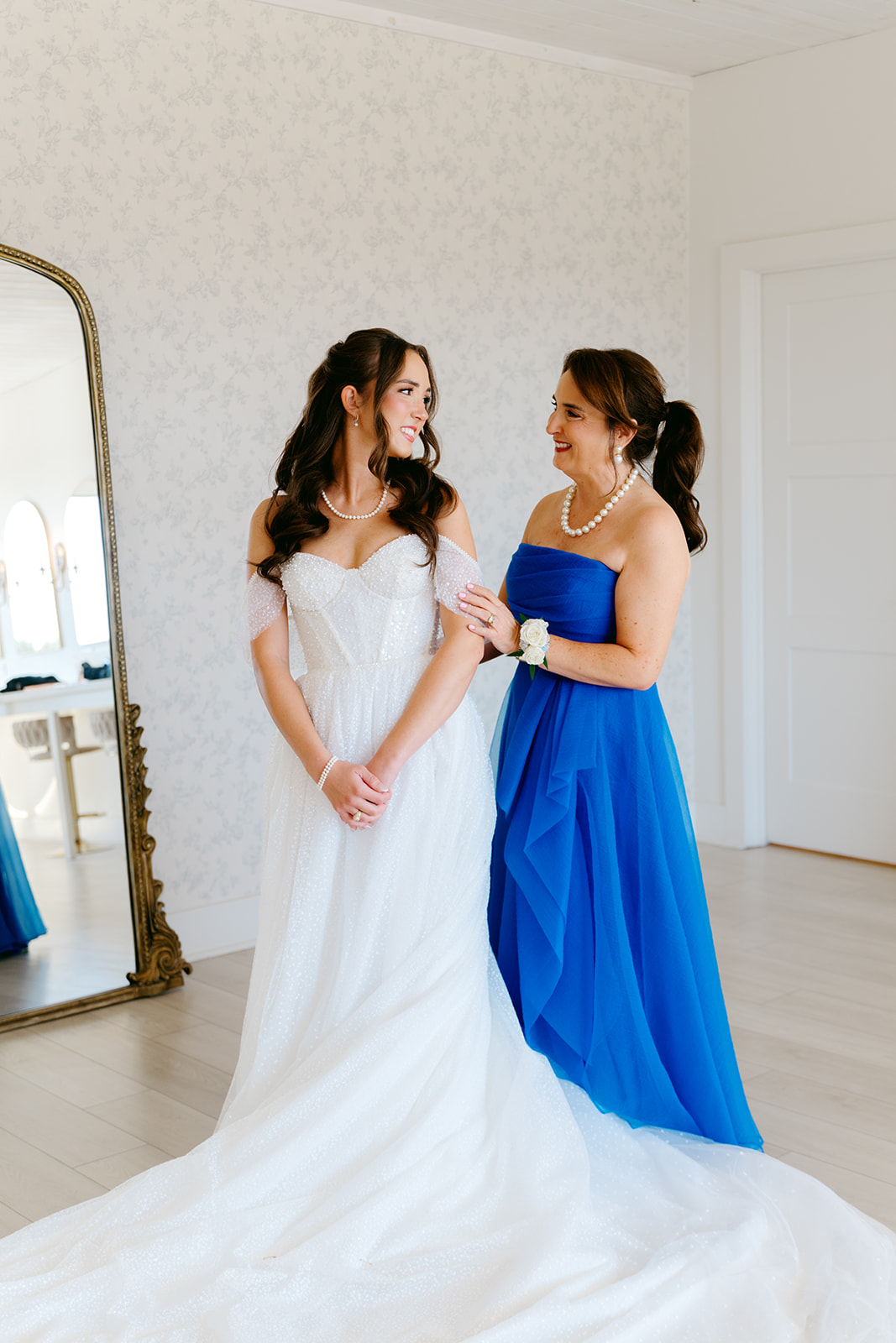 Her gown was timeless and romantic. The off-the-shoulder design featured a sweetheart neckline and delicate beading along the bodice. She wore her hair in loose curls styled half-up, half-down. The final touch was her stunning blue lace kitten heels, which tied beautifully into the wedding colors.