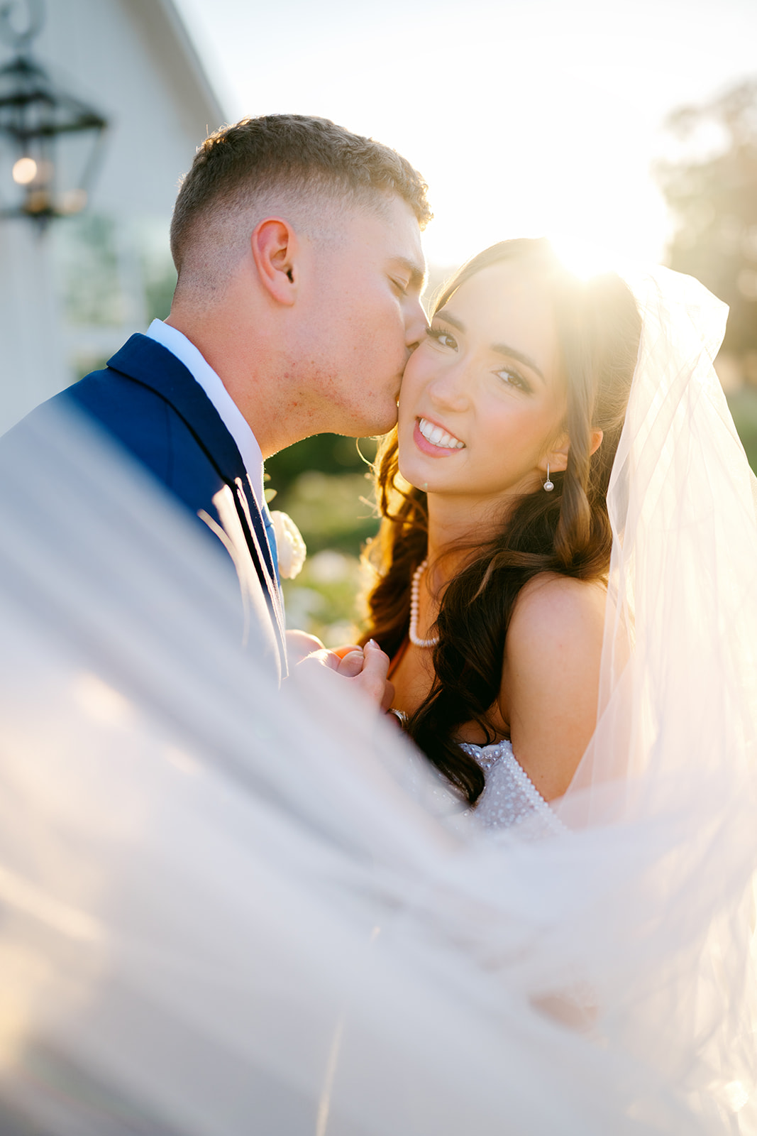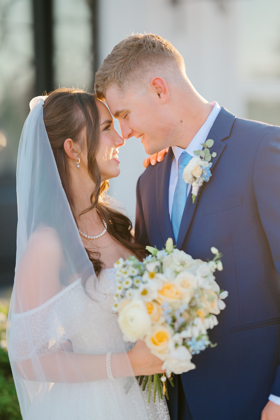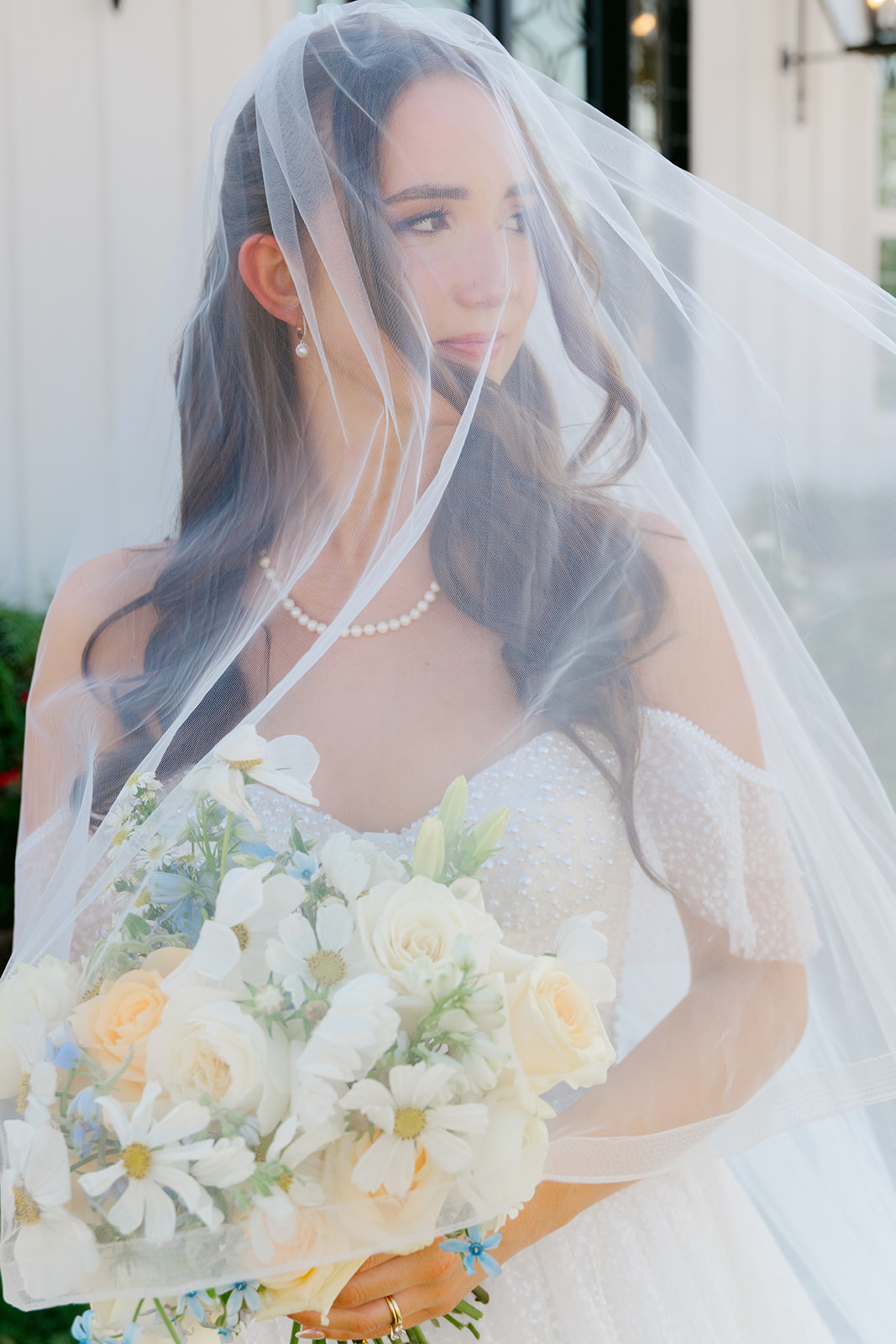 Her gown was timeless and romantic. The off-the-shoulder design featured a sweetheart neckline and delicate beading along the bodice. She wore her hair in loose curls styled half-up, half-down. The final touch was her stunning blue lace kitten heels, which tied beautifully into the wedding colors.