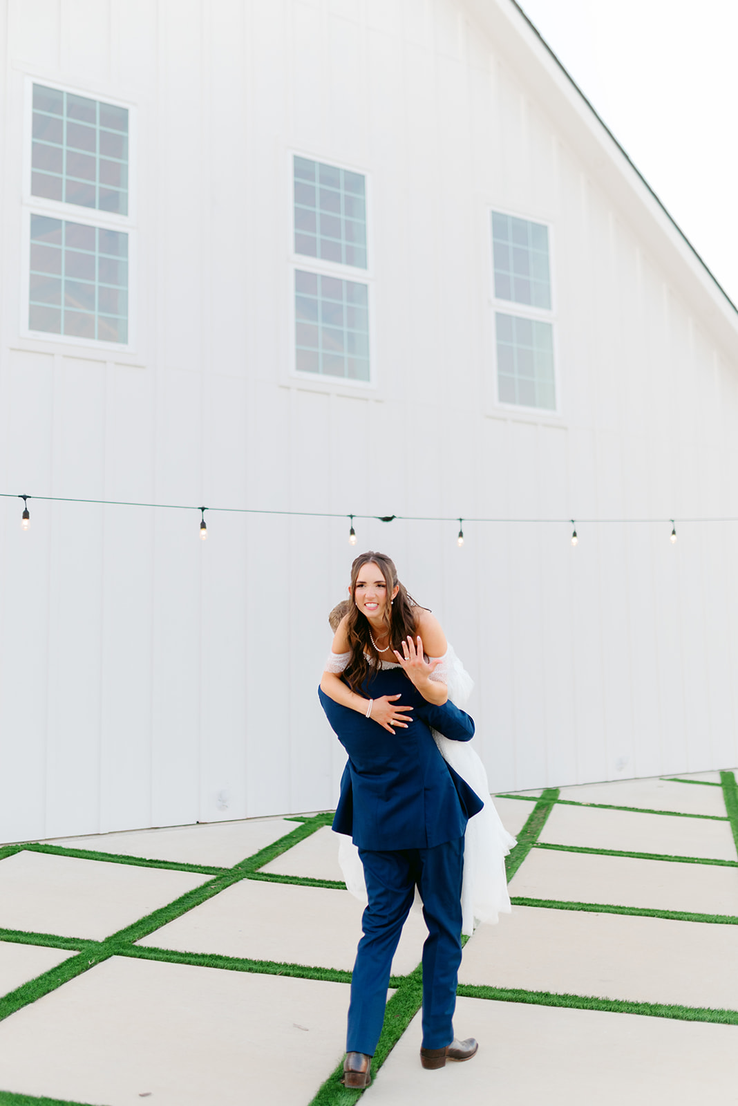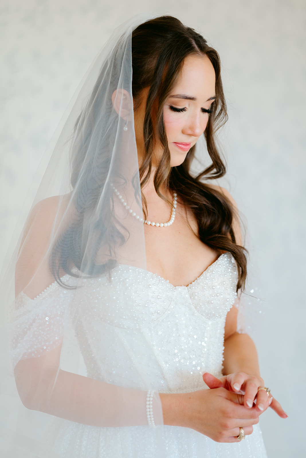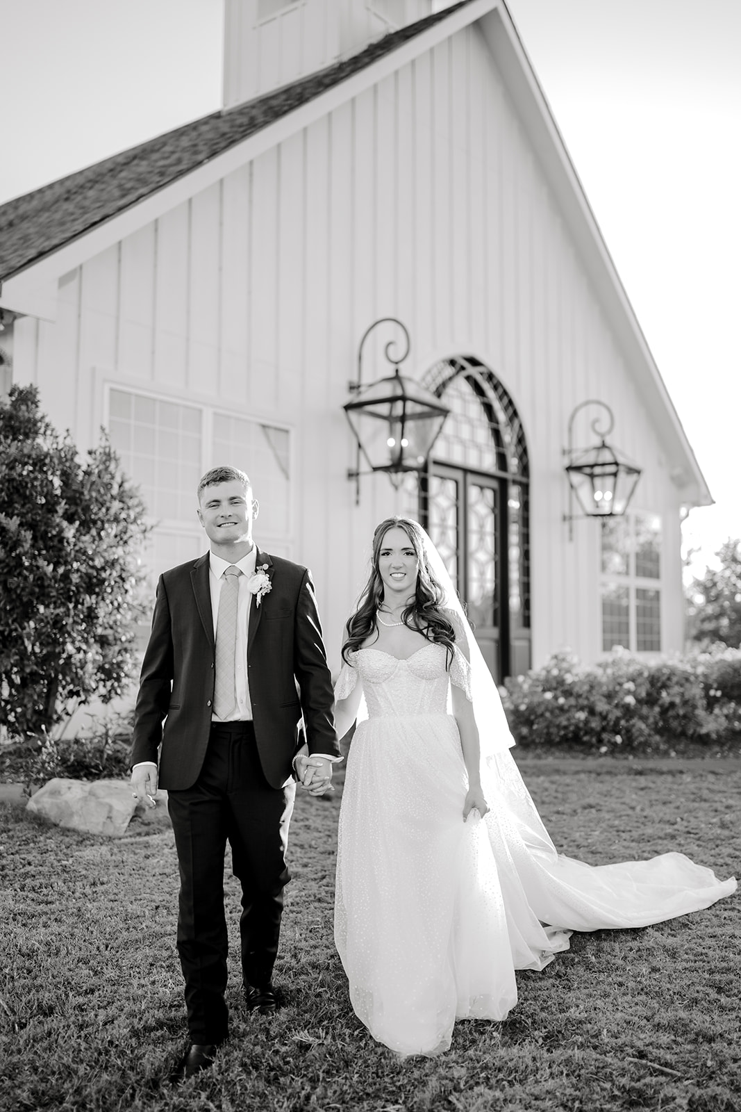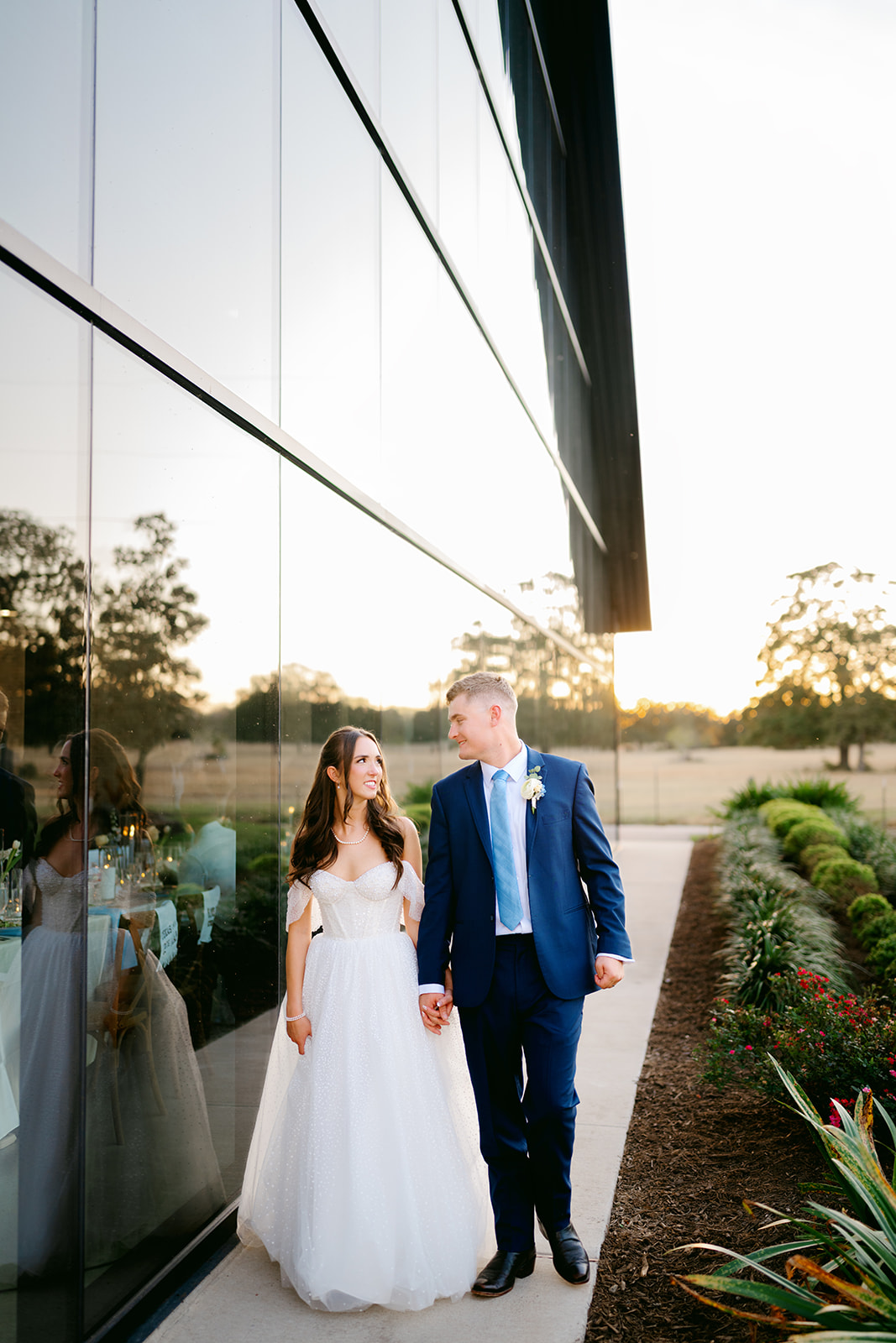 Her gown was timeless and romantic. The off-the-shoulder design featured a sweetheart neckline and delicate beading along the bodice. She wore her hair in loose curls styled half-up, half-down. The final touch was her stunning blue lace kitten heels, which tied beautifully into the wedding colors.