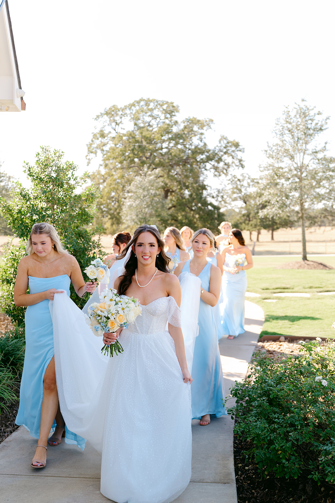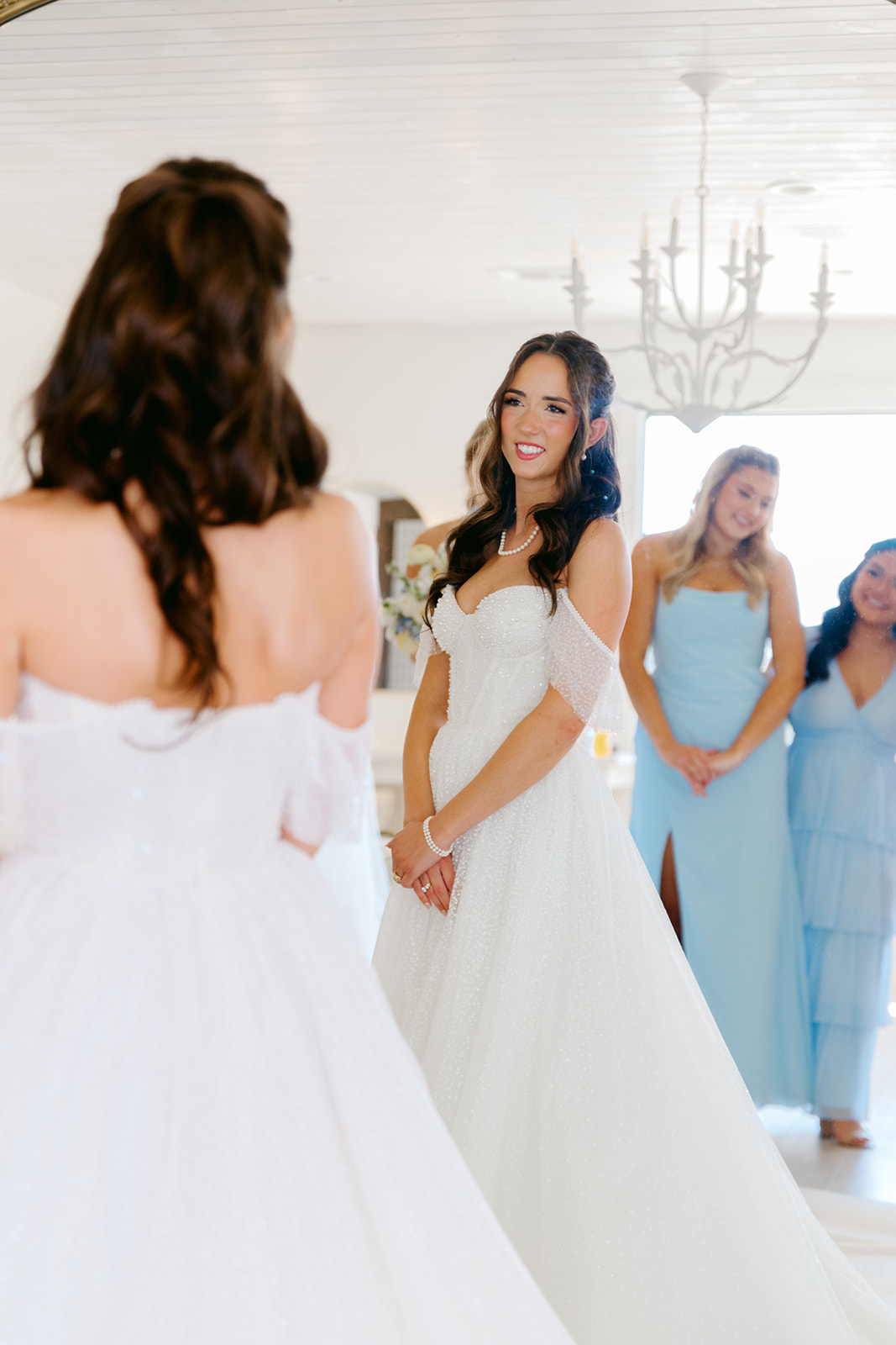 Kiera spent the morning with her bridesmaids, who wore light blue floor-length dresses in a variety of styles. The different silhouettes added dimension while keeping the look cohesive.