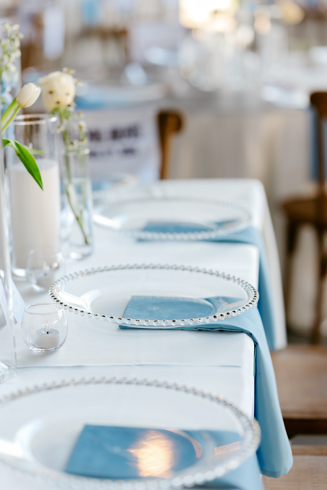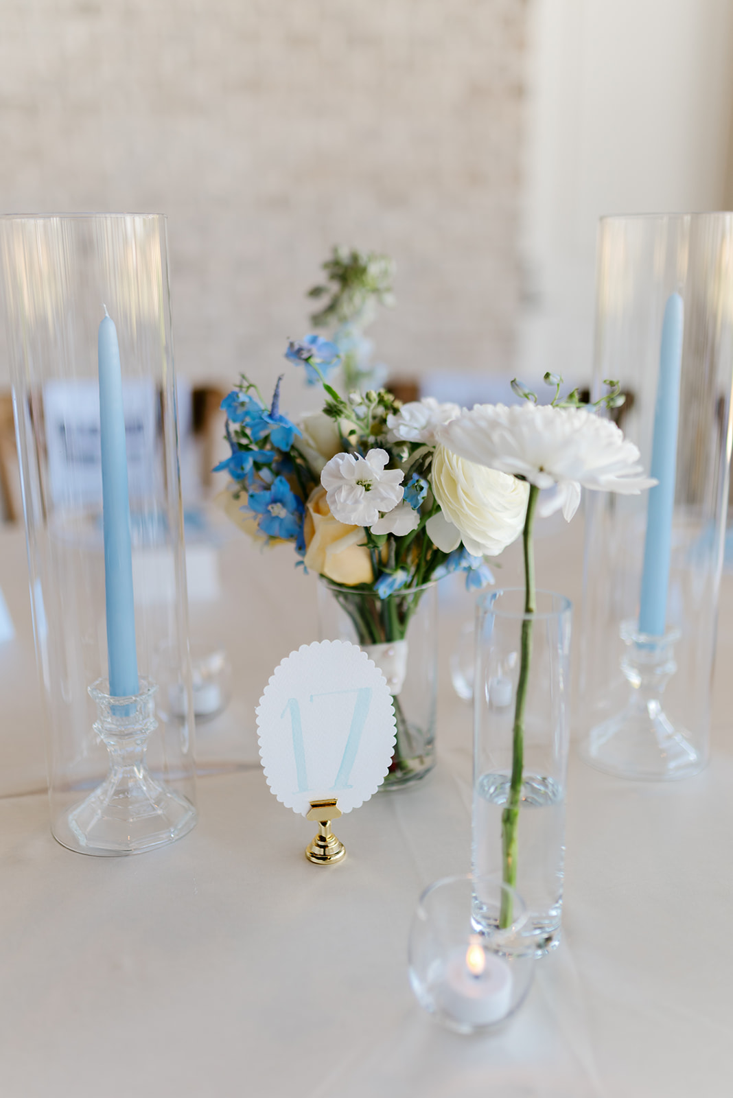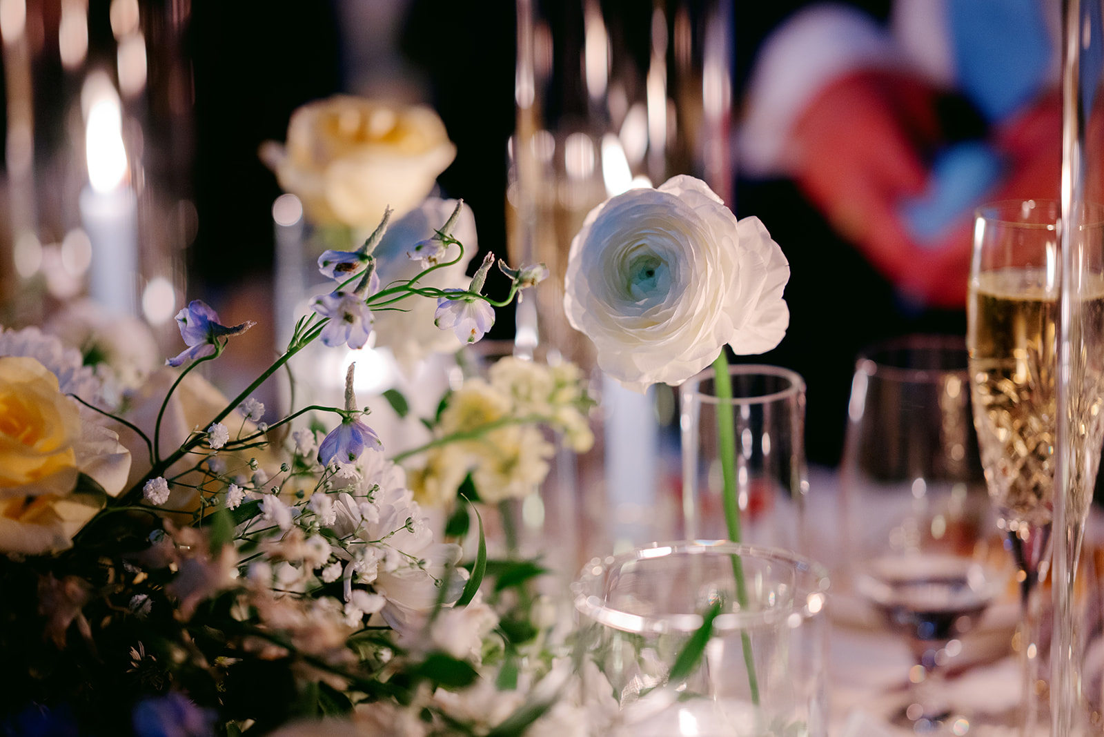 The reception design carried the blue and yellow palette beautifully. Bud vases filled with blooms in different textures were placed throughout the space. Every detail felt intentional and cohesive.