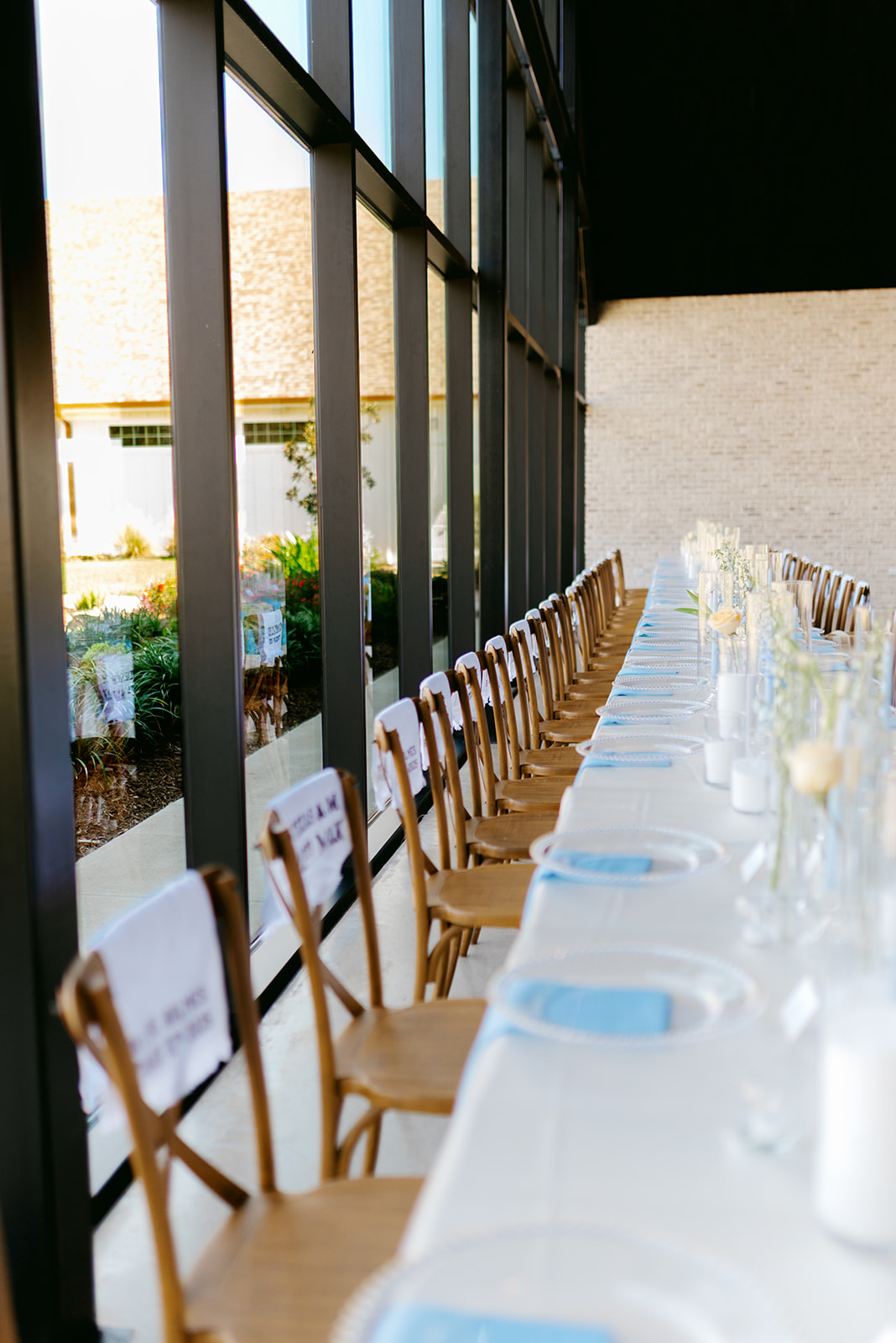 The celebration moved indoors to a reception space with a stunning floor-to-ceiling wall of windows. Natural light poured in, keeping the room bright and inviting.
