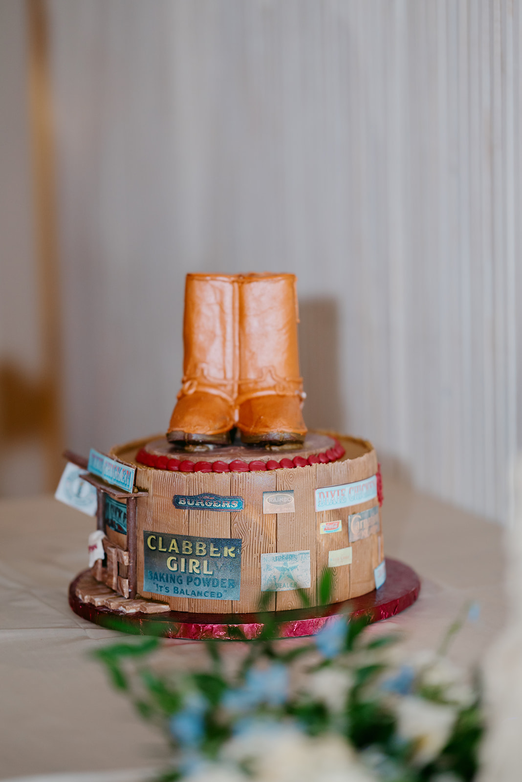 They shared a sweet first dance before cutting their cake. The three-tier textured wedding cake was elegant and timeless. The Western-themed groom’s cake added personality and charm. Heartfelt toasts followed, bringing both laughter and tears.